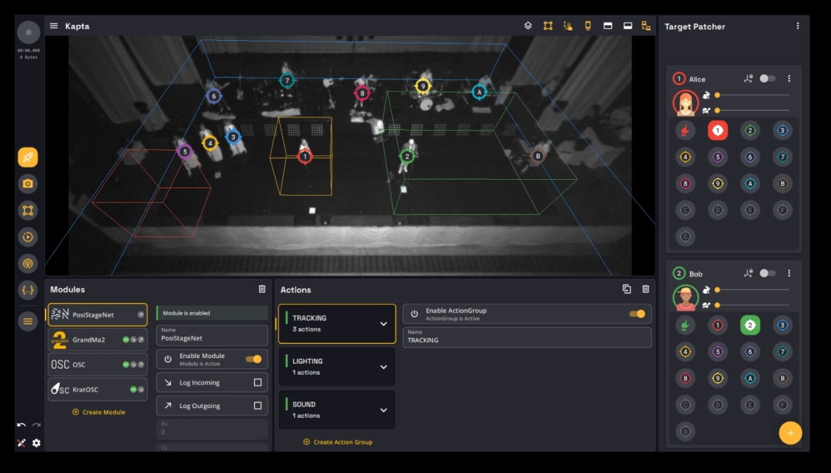 - KRATOS: Egy saját fejlesztésű, felhasználóbarát kezelőfelület, amely lehetővé teszi a vizuális kalibrációt, a követési zónák beállítását, valamint az automatizált cue-k és események indítását mozgás alapján (például amikor egy előadó egy zónába lép, aktiválódik egy fény- vagy hanghatás).