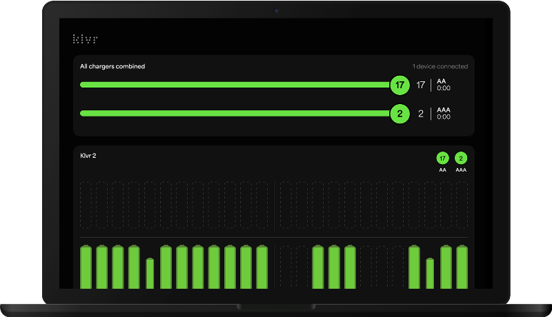 A Charger Pro hálózatra csatlakoztatva a Klvr Control szoftverrel teljes körű irányítást biztosít a töltőrendszer felett. A szoftver segítségével több eszköz állapota nyomon követhető, az egyes akkumulátorok töltöttségi szintje és töltési ideje ellenőrizhető, valamint a beállítások közvetlenül módosíthatók Mac vagy Windows számítógépről.