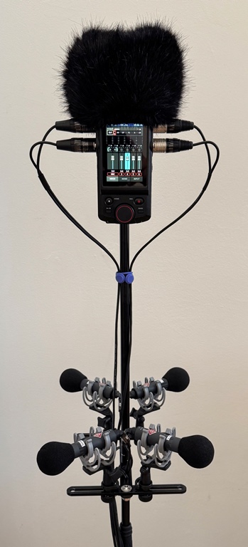 A második gyakran használt felvevőm a Portacapture X8, melyről Zagyva Tamás korábban már bővebben írt. Ez tulajdonképpen egy érintőképernyős, egy pár sztereó saját mikrofonnal és 4 XLR/Jack bemenettel kombinált, sokoldalú, hatcsatornás hangfelvevő, amellyel pl. egy többszereplős, többmikrofonos interjú vagy podcastfelvétel is jó minőségben megoldható. A saját mikrofonok a kategóriájában nagyon jó jel/zaj tulajdonsággal rendelkeznek, picit nagyobbak is a kapszulák, a mély hangok átvitelében is gazdagabbak a kisebb felvevőkhöz képest, és a különálló 4 mikrofonbemenet egészen kiváló minőséget képvisel a hordozható felvevők piacán. Nem utolsó sorban a külön beszerezhető AK-BT1 Bluetooth adapterrel okostelefonról vezérelhető a felvétel és a beállítások. Én gyakran használom csak a saját mikrofonját széles sztereóra nyitott (A-B) beállításban különböző természeti hangok és városi atmoszférák felvételére, de készítettem már 4 „cardioid” mikrofonnal kiegészített immerzív városi hangfelvételt is, melyben a két, előre és hátrafelé irányított ORTF típusú sztereó mikrofonpárral kiegészítve a megfelelő szoftveres kódolás után akár költséghatékony 7.1.2-es Dolby Atmos kompatibilis hangkép is létrehozható.