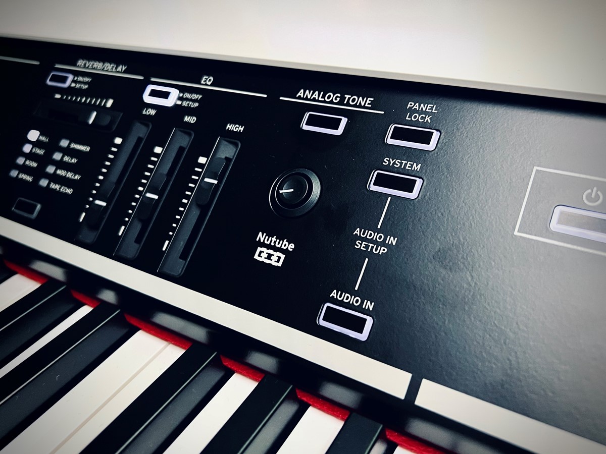 Apropó lead szinti. A hangszer rendelkezik a korábban említett Nutube csöves torzítással, mely egy gombbal ki-be kapcsolható, valamint a szexi süllyesztett potméterével adagolható. Szinti hangszíneknél ez egy csodás szőrt ad hozzá pluszba, hogy még jobban kiszóljon a hangszer a zenekarból. Ugyanezt a szaturálást próbáltam rhodes hangszínen is, szépen rottyantja!